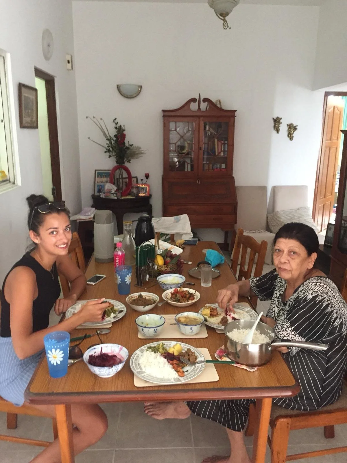Archchi and I enjoying Archchi's food in her apartment in Colombo (2018)