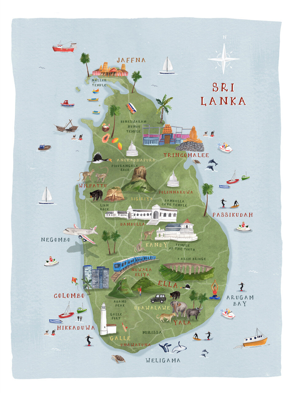 The beautiful tropical island of Sri Lanka itself, hand drawn and painted by the talented Helen Wallace Illustration.